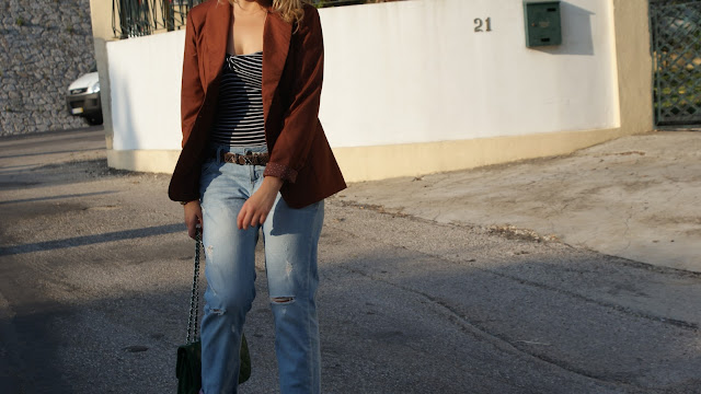 Há muito que andava para comprar um blazer mas queria um que tivesse uma cor diferente... Escolhi este quando o vi este na Lefti`s. Gosto do corte e textura do blazer, acredito que foi usar muito, seja com saias, calças, calções...